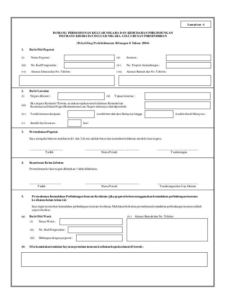 Insurans Ke Luar Negara Bagi Penjawat Awam Duduk Bersila. Lampiran a borang permohonan ke luar negara dan kemudahan perlindungan insurans kesihatan di luar negara atas urusan persendirian peliling perkhidmatan bilangan 8. Borang permohonan ke luar negara dan kemudahan perlindungan.